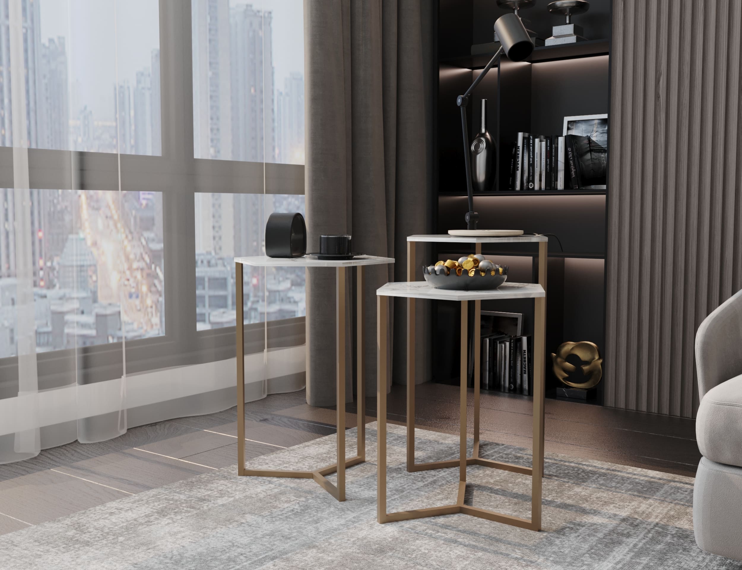 ترابيزة تريبل ترابيزة جانبية من 3 قطع بأطوال متدرجة، بتصميم عصري فريد، يأخذ سطحها المصنوع من الرخام الأبيض شكل سداسي، بينما يتكون الهيكل من 3 أعمدة ذهبية اللون تمتد من زوايا السطح وتتقاطع في النهاية مكونة قاعدة على شكل حرف X، مما يعطي الترابيزة شكل مميز وأنيق.