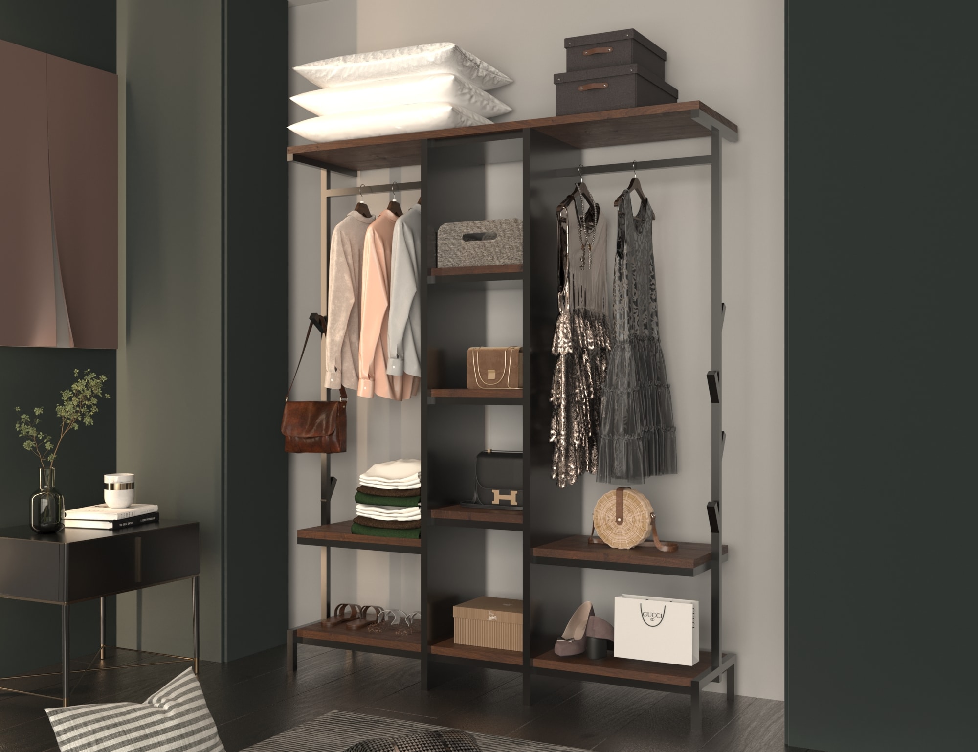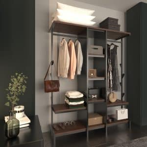 صممت بعناية لتجمع بين الوظيفة والجمال، بتفاصيل من الحديد المطلي والرفوف الخشبية التي تضيف لمسة دافئة وعصرية لأي غرفة نوم أو غرفة ملابس