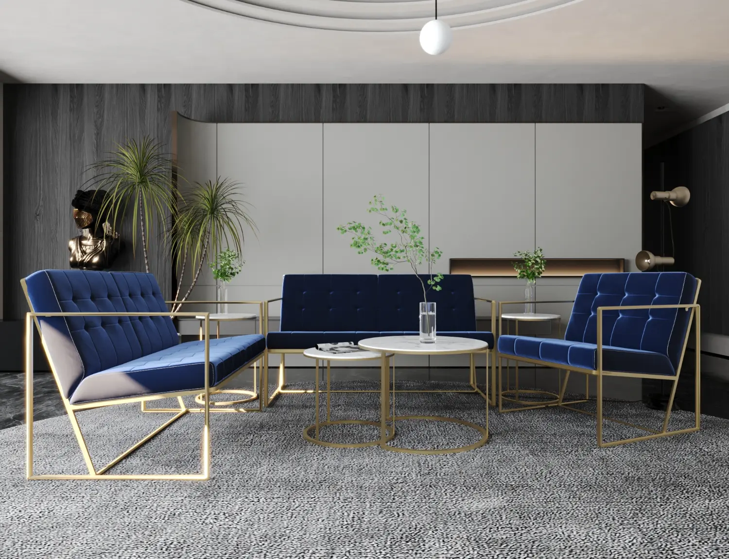 - خامة الصنع: هيكل الانتريه مصنوع من الستيل عالي المتانة، مع تنجيدة من القطيفة الناعمة بلونه الأزرق.