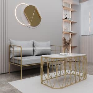- اللون: الهيكل مطلي باللون الذهبي، والكنبة والكراسي متنجدين بمقاش قطيفة باللون الأزرق الملكي، وسط الترابيزات من الرخام كرارة الأبيض.