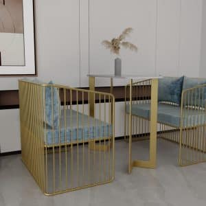 جاءت كراسي الانتريه متنجدة لإعطاء شعور بالراحة، كما توجد معه ترابيزة مستطيلة متوسطة الحجم مصنوعة من الاستيل المتين مع سطح من رخام الكرارة الذي يجعلها تتناسب مع أنماط الديكور المختلفة.