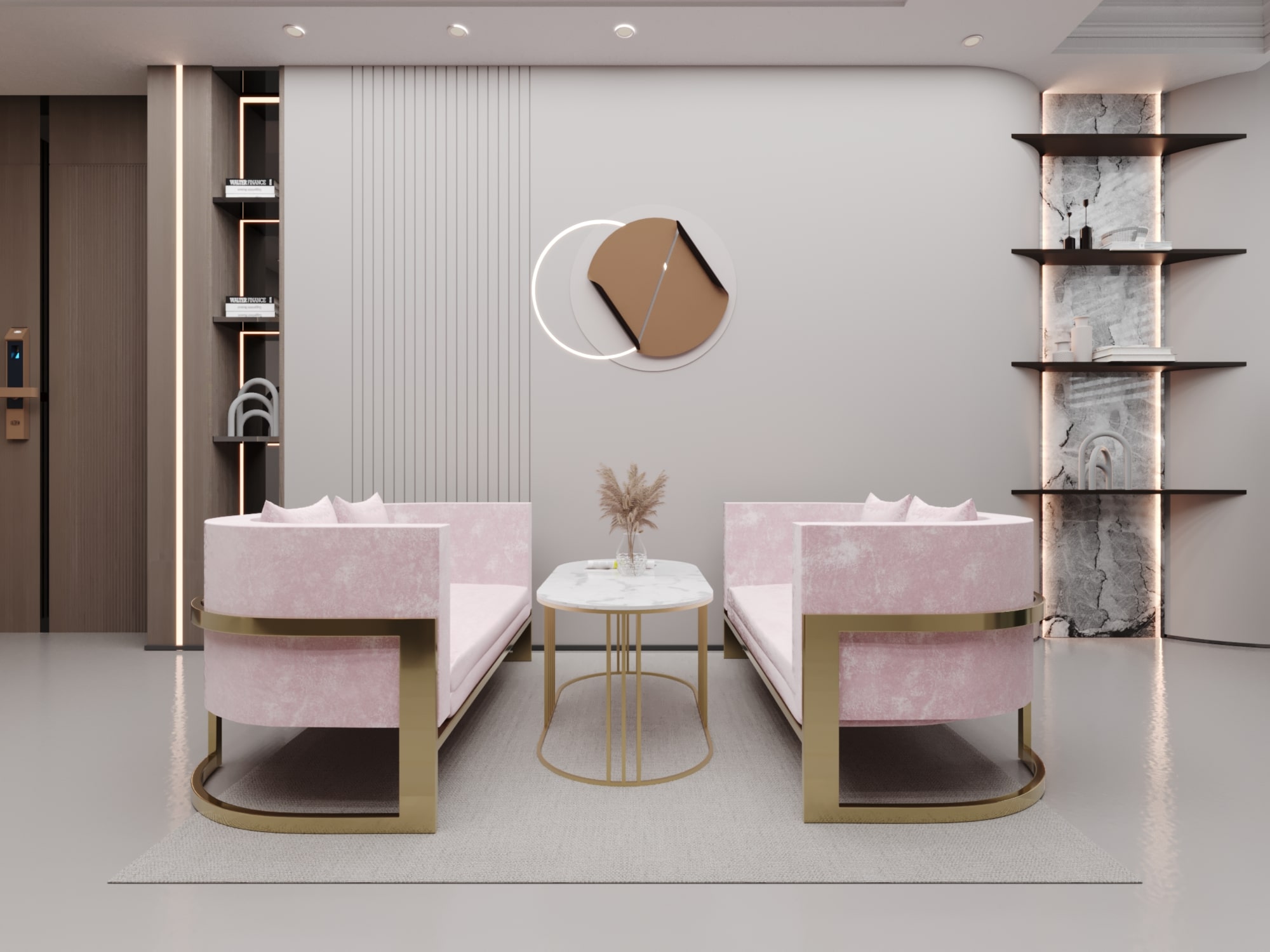 - الخامات: هيكل من الاستيل، سطح الطاولة من رخام كوارتز، وتنجيد الكنب من قماش قطيفة.