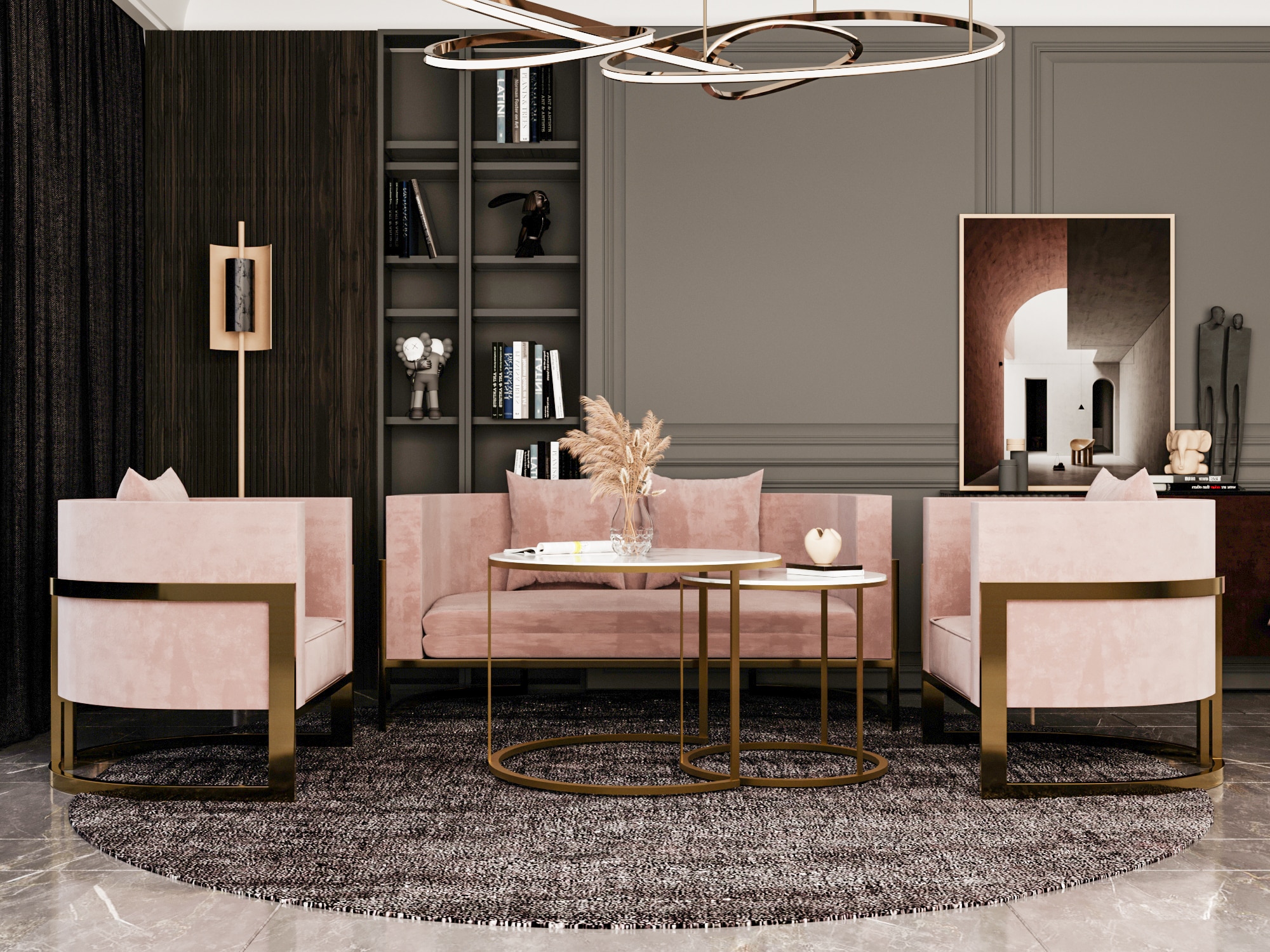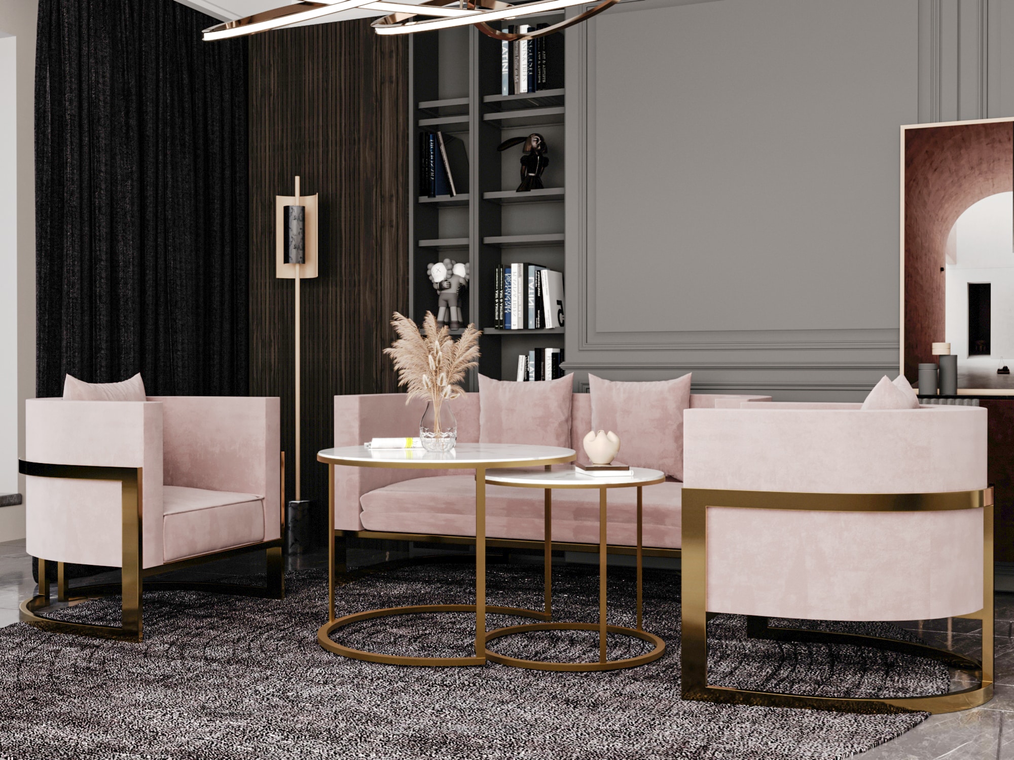 • سطح الكنبة والكراسي من القطيفة باللون البينك المميز.