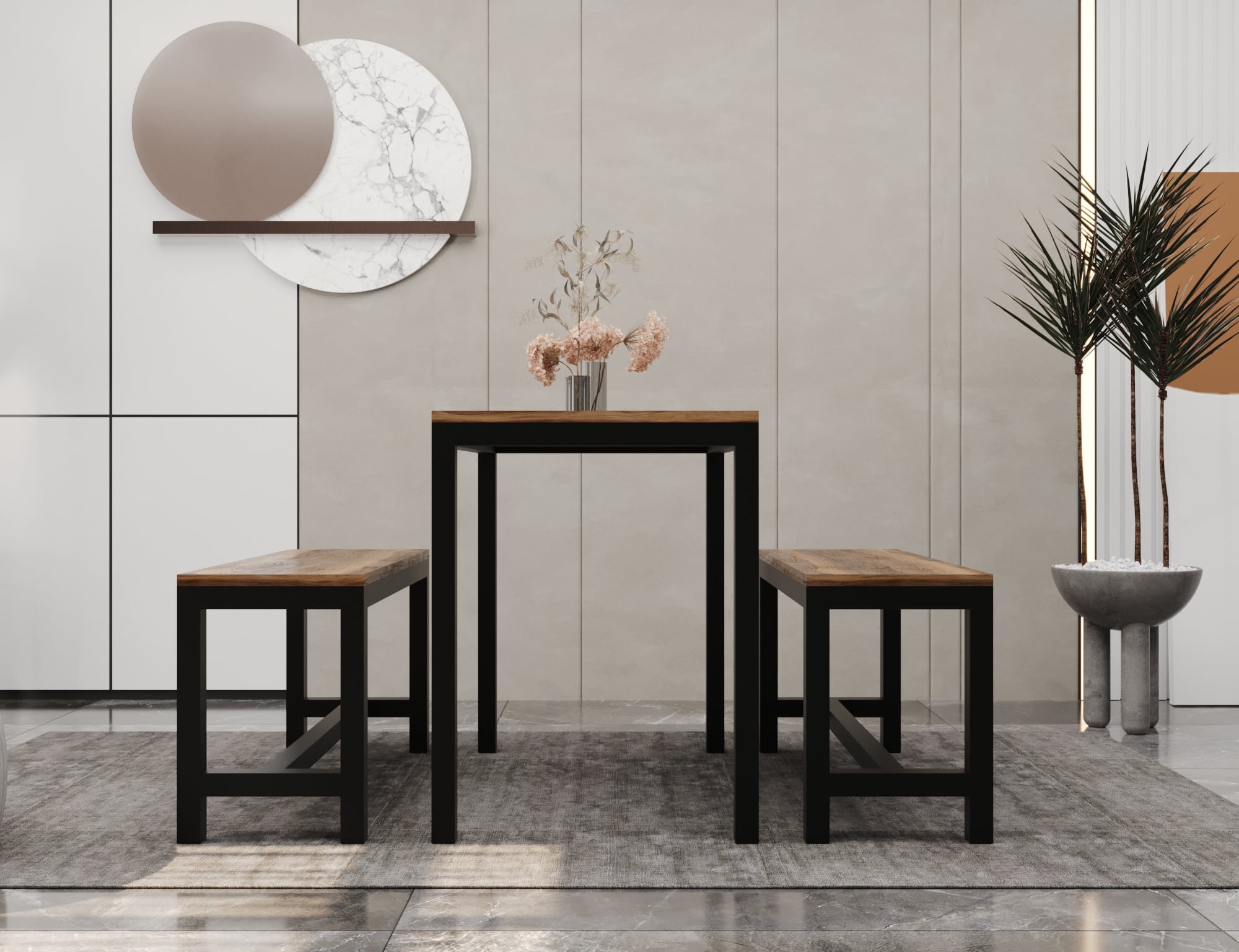 طقم سفرة مدار، سفرة مودرن صغيرة تمتاز بتصميمها الذي يجمع بين الأناقة والبساطة، تتكون من ترابيزة سفرة مودرن خشب وكرسيين طويلين، مصنوعة من الستيل وخشب ام دي اف المطلي بدهان الكتروستاتيك مضاد للصدأ والرطوبة ما يمنحها مزيد من العملية.