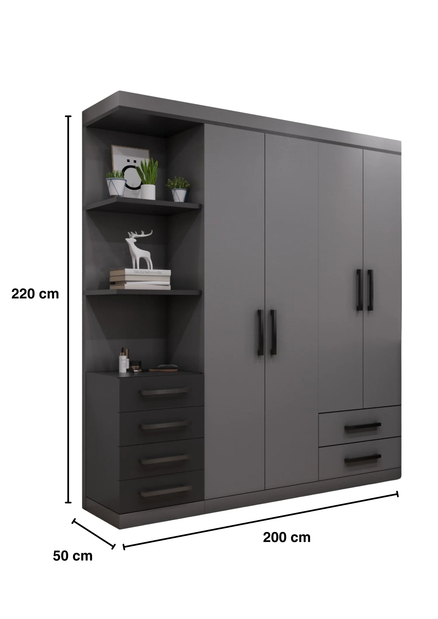 - يسار الدولاب يتكون من 3 أرفف مكشوفة + 4 أدراج أسفلهم